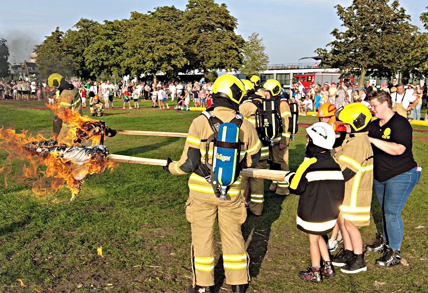 Het spektakel werd versterkt door overal aanwezige brandweerslangen en watervernevelende apparaten, bediend door enthousiaste leden van de jeugdbrandweer. Het vuur groeide gestaag en zorgde voor een warme sfeer die het publiek dwong om langzaam achteruit te bewegen.