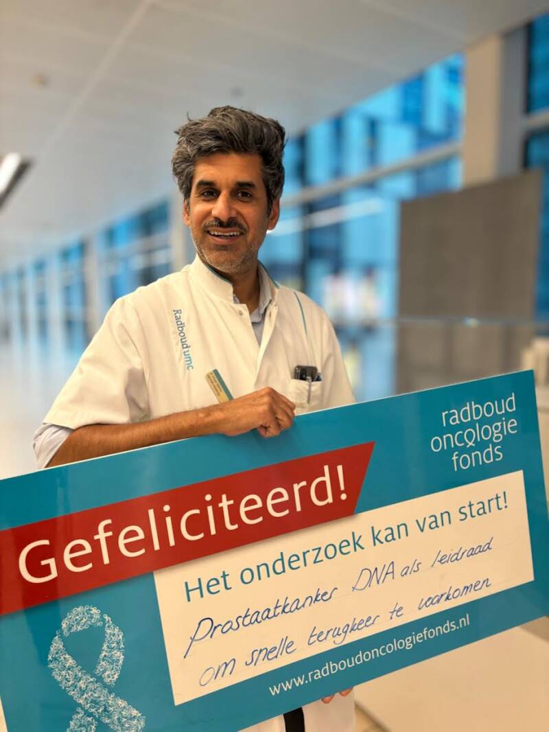 De overhandiging van de cheque vindt vandaag plaats op de laatste dag van Movember, de maand waarin prostaatkanker wereldwijd aandacht kreeg. Hoofdonderzoeker dr. Niven Mehra, werkzaam op de afdeling urologie van het Radboudumc in Nijmegen neemt de cheque namens het hele onderzoeksteam in ontvangst. Hij wordt bijgestaan in dit
