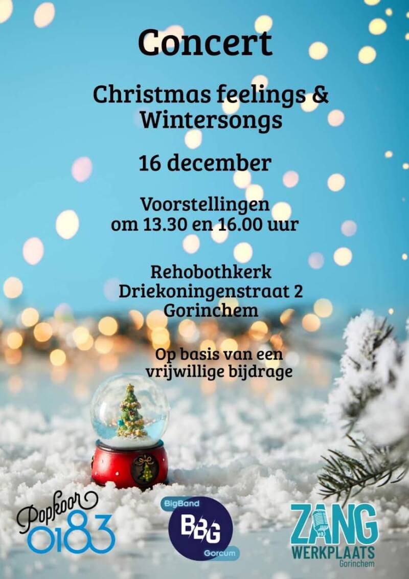 Op zaterdag 16 december 2023 zetten Bigband Gorcum, Zangwerkplaats Gorinchem en Popkoor 0183 opnieuw een spectaculaire middag vol muziek, gezelligheid en saamhorigheid neer, wegens het immense succes van vorig jaar.