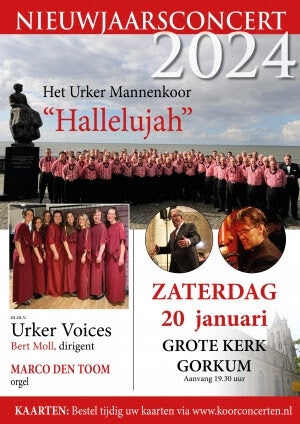 Zaterdag 20 januari a.s. komt het landelijk bekende Urker Mannenkoor "Hallelujah" samen met Urker Voices naar de Grote Kerk van Gorinchem om daar zijn tradtionele Nieuwjaarsconcert ten gehore te brengen.