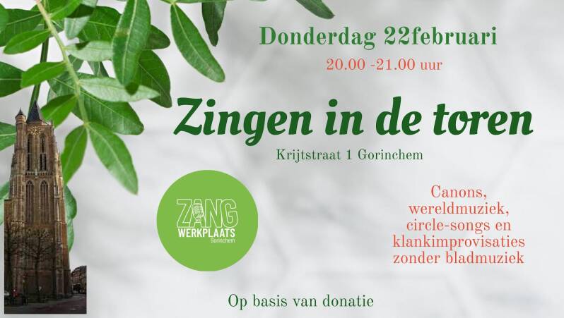 Op donderdag 22 februari organiseert Helga Buitelaar van Zangwerkplaats Gorinchem weer een uurtje samen zingen in de toren van Gorinchem. Iedereen is welkom!
