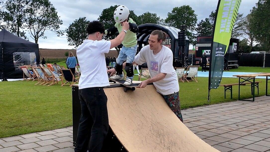 Jongerenwerk The Mall was er weer met een mobiele skatebaan. Je zag jongeren van allerlei leeftijden die de moed hadden om van de steilste helling af te rollen, eventueel ondersteund door twee krachtige begeleiders van The Mall.