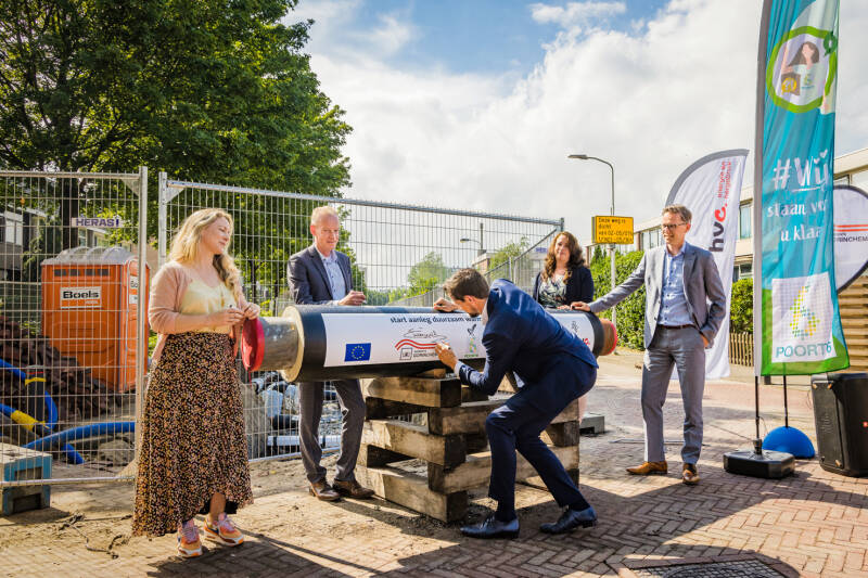 Donderdag 19 mei 2022 zetten 5 bestuurders in aanwezigheid van huurders en andere betrokken wijkbewoners hun handtekening op een grote warmtenetleiding. Hiermee werd de officiële start van de aanleg van het warmtenet in de Gildenwijk in Gorinchem op bijzondere wijze gemarkeerd. Een echte mijlpaal als opmaat naar een aardgasvrije wijk.